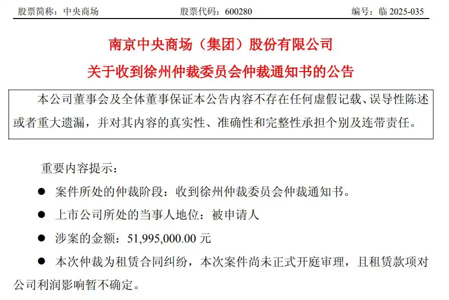 即使仍有“中华老字号百货”的光环在身,中央商场(600280)近年的日子也不好过。9月5日晚间,中央商场发布公告,近日公司收到徐州仲裁委员会的仲裁通知书,涉及的案件为租赁合同纠纷,公司在此案件中为被申请人,涉案金额为5200万元。