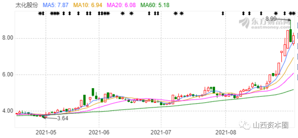 山西资本圈注意到,从2021年5月宣布更名以来,太化股份可谓一路走高,已从最初的每股4元左右涨至现在每股8元左右,成功实现翻倍,整体表现不俗。如今,在正式完成股票简称变更后,上市公司能否继续乘势而上值得关注。