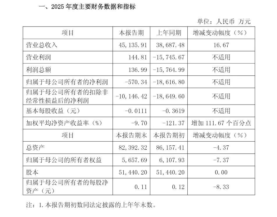4月4日,山西本土上市企业华阳新材(600281)发布2025年年度业绩快报,这份未经审计的财报交出了一份喜忧参半的答卷:营收4.51亿元同比增长16.67%,归母净亏损收窄至570.34万元,较上年的1.86亿元大幅减亏97%。但扣非净利润仍亏1.01亿元,子公司经营冰火两重天,17年扣非连亏的底色并未改变。《晋才晋商》深耕山西产业研究,从财报细节、产业逻辑与企业布局,解读这家晋企的转型困局与破局方向。