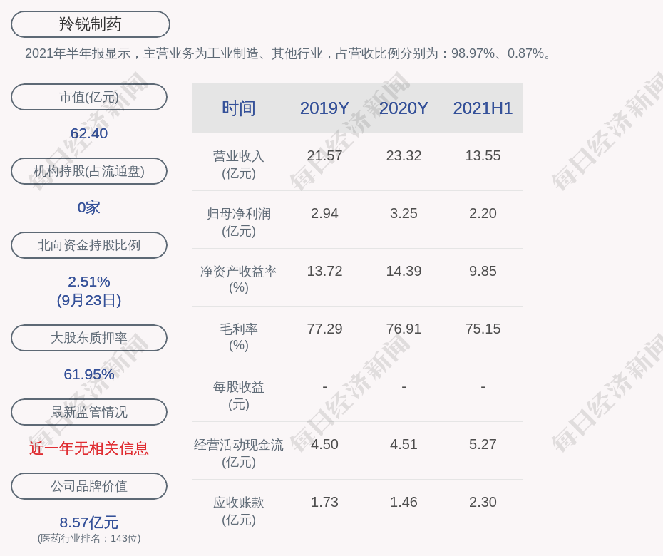 2021年半年报显示,羚锐制药的主营业务为工业制造、其他行业,占营收比例分别为:98.97%、0.87%。