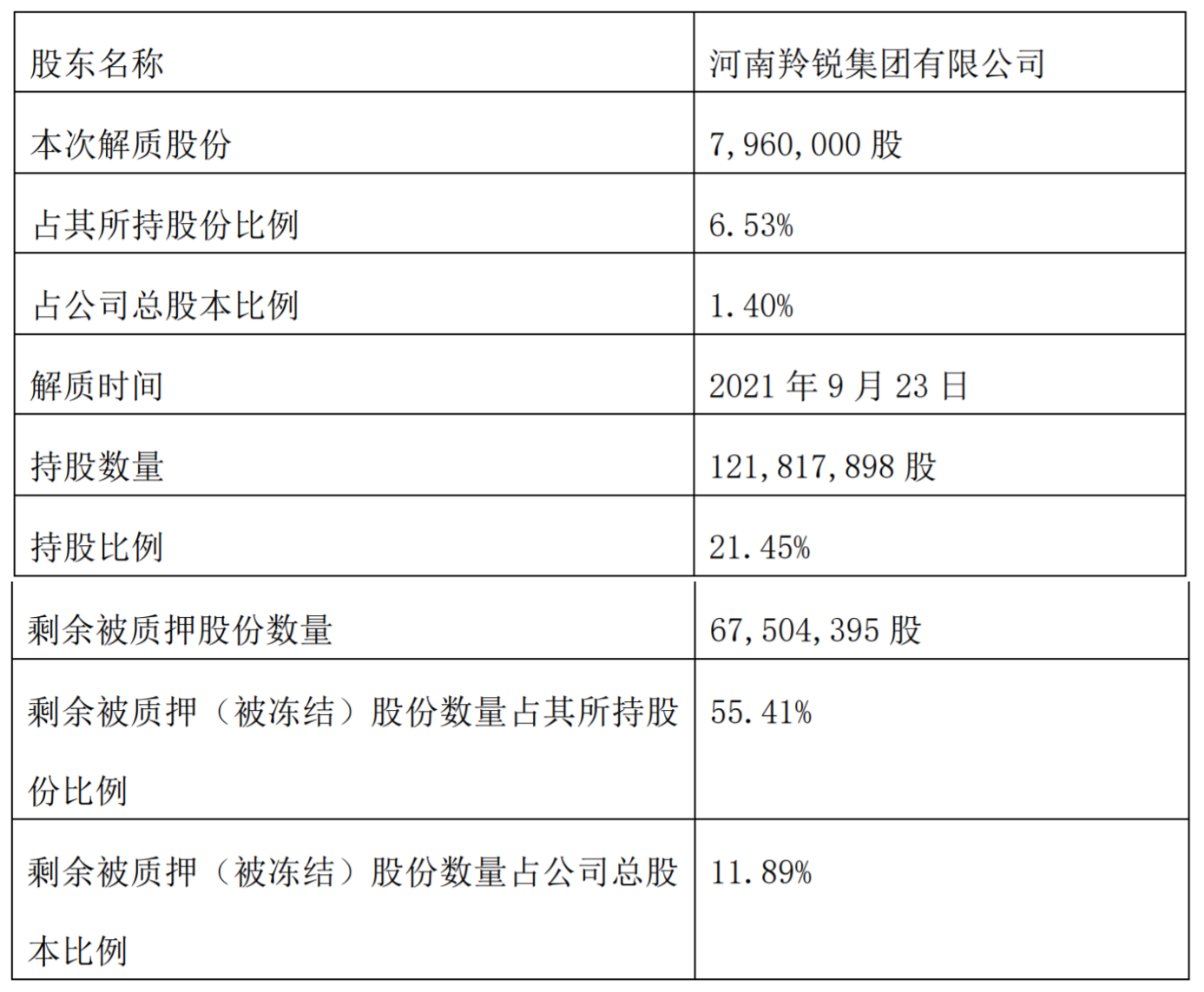 乐居财经讯邓如菲 9月24日,河南羚锐制药股份有限公司(以下简称“羚锐制药”)发布关于大股东部分股份解除质押的公告。