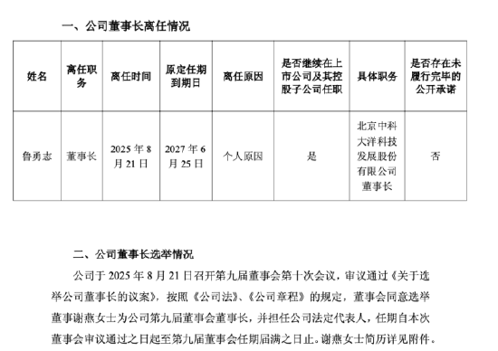大恒新纪元科技股份有限公司(以下简称“大恒科技”)于8月22日发布公告,公司董事会审议通过董事长变更事项。