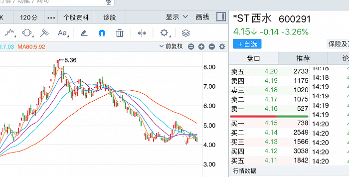 那么,在多次风险天提示下,*ST西水的股价已一跌再跌。从2021年11月11日算起至今,*ST西水股价已经腰斩,股价从最高的8.36元,跌到了目前的4.11元。