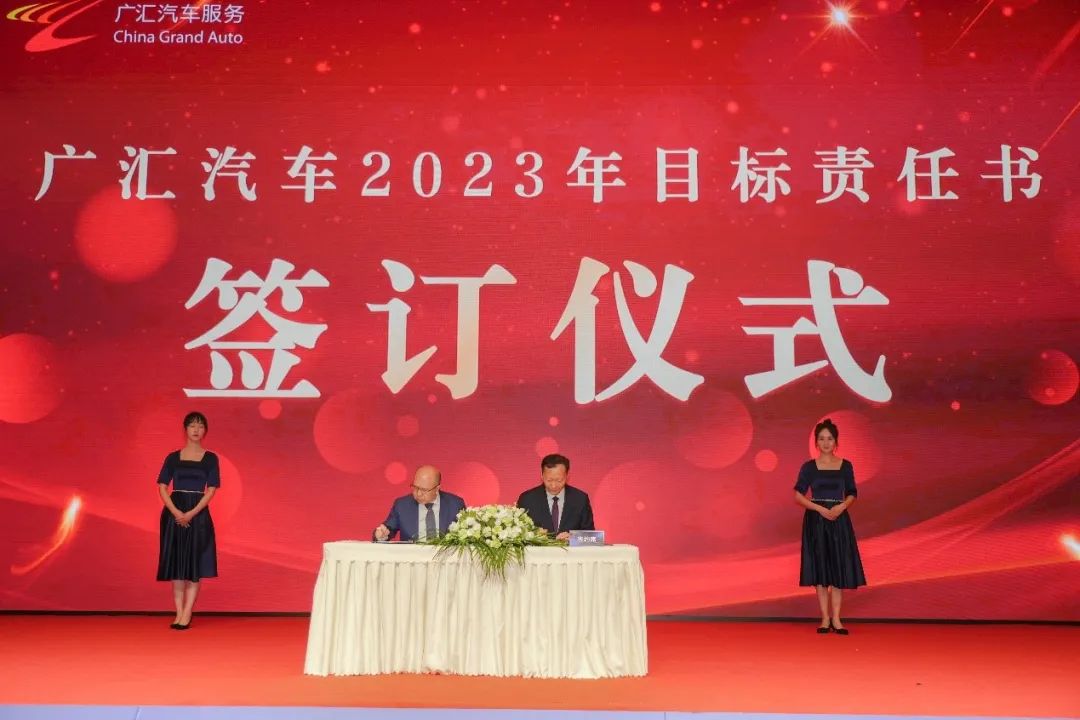 广汇集团副董事长、总裁宋东升与广汇汽车董事长马赴江共同签定《2023年广汇汽车经营目标责任书》,把牢了改革发展的方向盘,吹响了新年新征程的集结号。