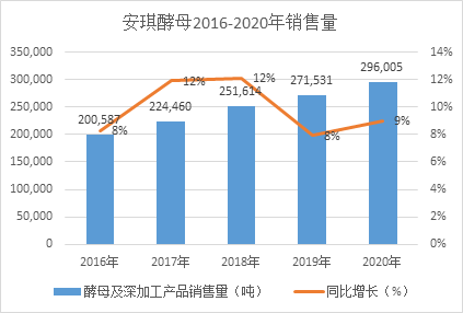 2016年~2020年,安琪酵母产品销量分别为20.06万吨、22.45万吨、25.16万吨、27.15万吨、29.60万吨,同比增长分别为8%、12%、12%、8%、9%。不难看出,近年来安琪酵母的产品销量亦呈现出了逐年放缓的势态。