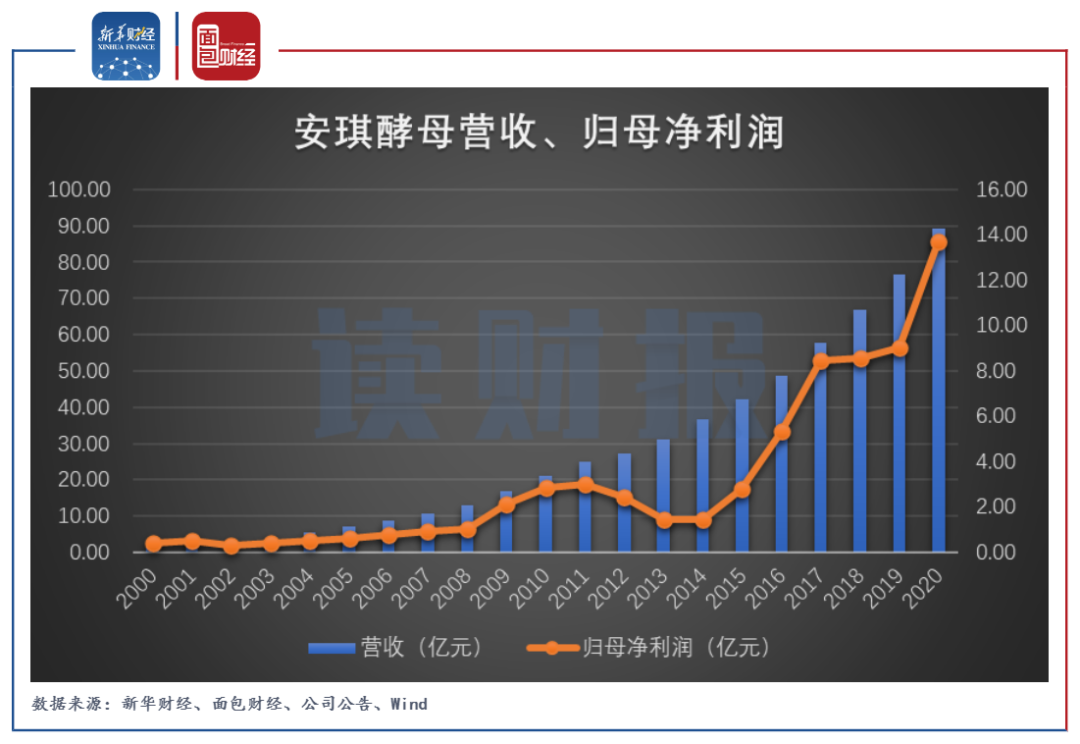 安琪酵母于2000年登陆上交所,上市以来公司营收从2000年1.84亿元上升至2020年89.33亿元,年均复合增速达到21.40%;同期的归母净利润从0.42亿元上升至13.72亿元,年均复合增速为19.11%。