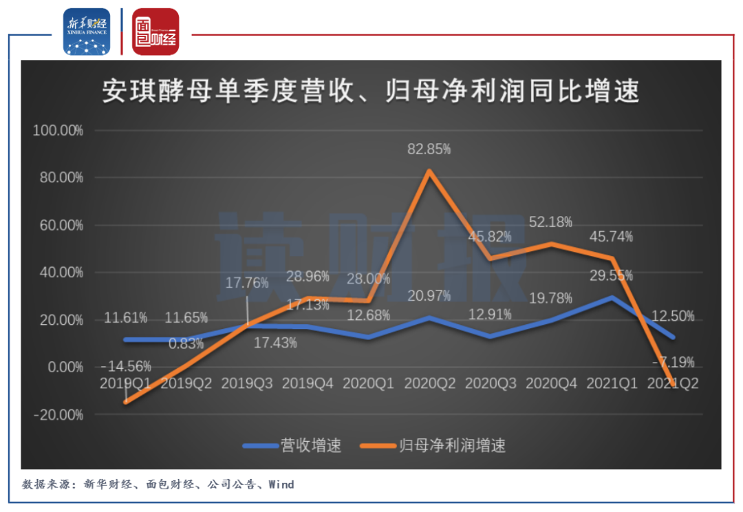 2021年一季度,安琪酵母在业绩基数并不低的情况下,继续维持较快增长,期间营收、归母净利润分别同比增长29.55%和45.74%。但最新披露的2021年半年报显示,公司业绩在第二季度出现明显放缓,营收同比增速降至12.50%;归母净利润同比下降7.19%。
