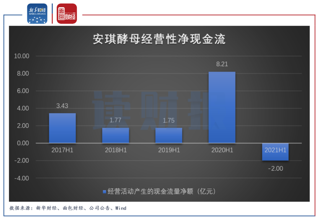 另外值得注意的是,安琪酵母今年上半年产生的经营性净现金流为-2.00亿元,相较上年同期的8.21亿元大幅回落,这也是公司近5年来首次出现上半年经营性净现金流为负。对此,公司的解释是购买商品、接受劳务支付的现金增加。