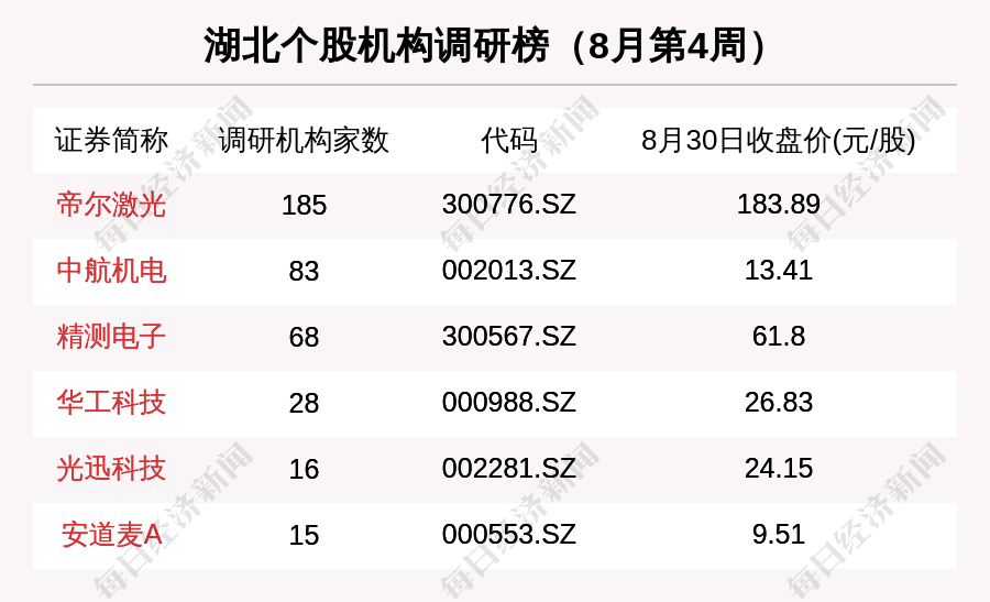 机构调研方面,据统计,8月第4周,有6家湖北上市公司接受机构调研。其中,185家机构到访帝尔激光,83家机构到访中航机电,68家机构到访精测电子,28家机构到访华工科技,16家机构到访光迅科技。