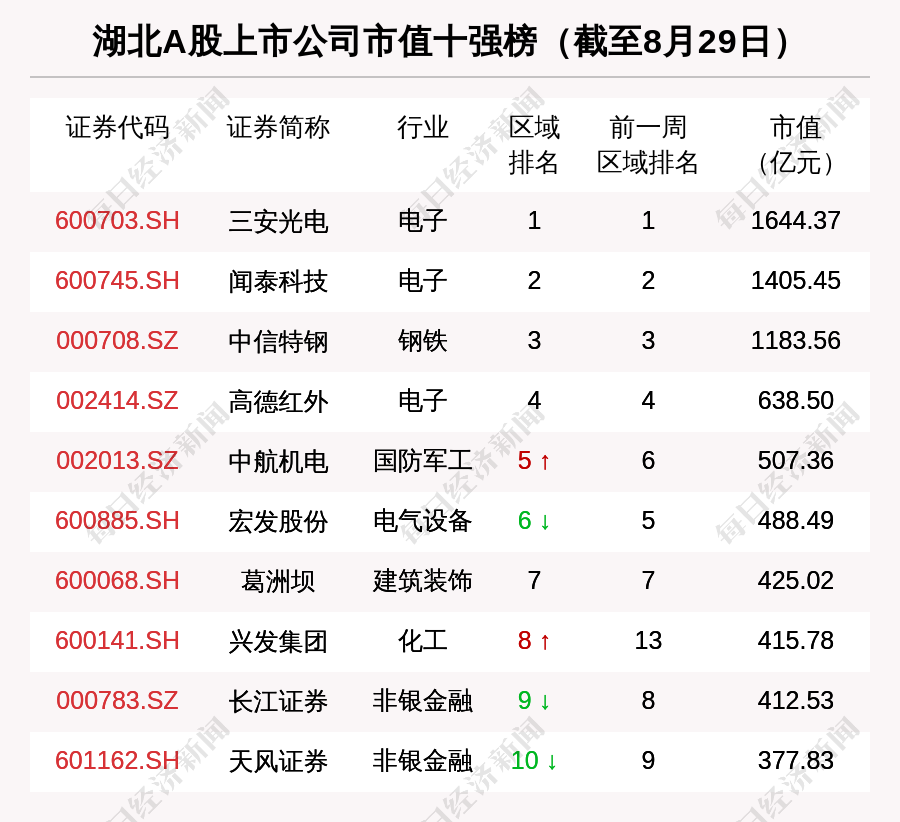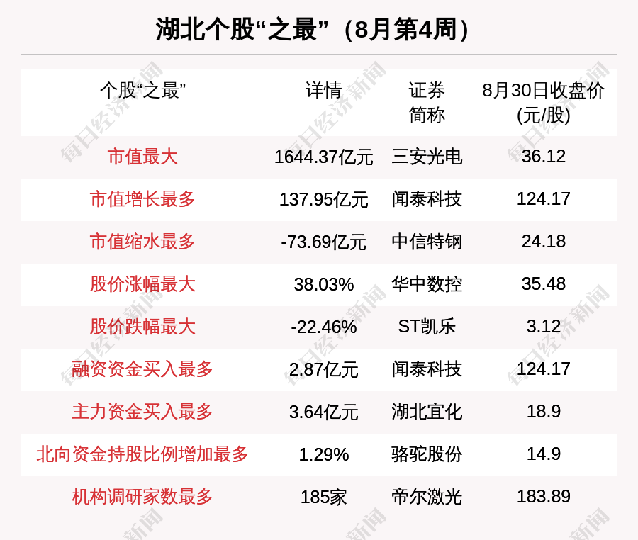 截至8月29日,湖北板块市值最大的是三安光电,市值最小的是*ST凯瑞。上周市值增长最多的是闻泰科技,增长137.95亿元;市值缩水最多的是中信特钢,缩水73.69亿元。