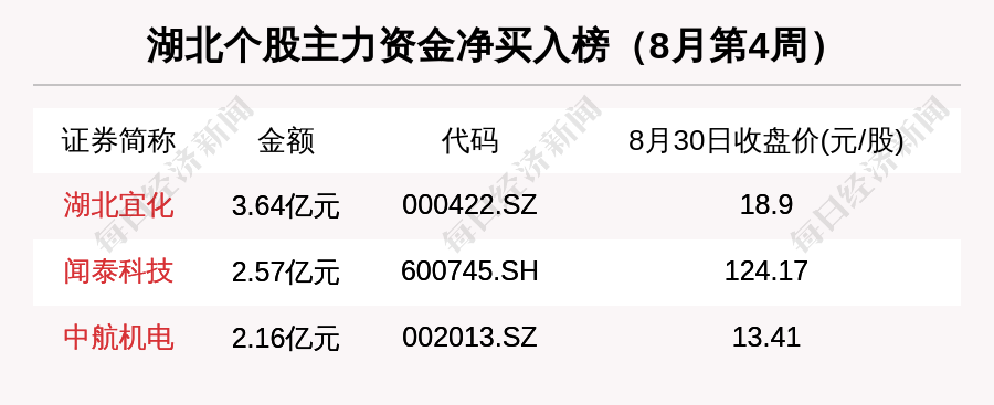 主力资金方面,8月第4周,湖北宜化净买入额居首位,为3.64亿元,其次是闻泰科技(2.57亿元)和中航机电(2.16亿元)。