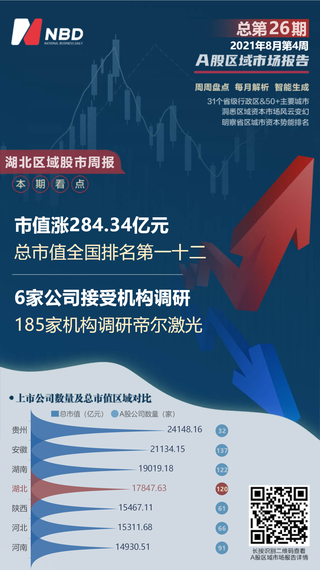涨跌幅方面,截至2021年8月29日,湖北板块市值与前一周相比,区间涨幅为1.76%(加权平均值),涨幅排名全国第26位。