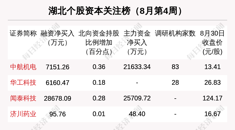 8月第4周(2021年8月23日~2021年8月29日),湖北股中,闻泰科技市值增长最多;中信特钢市值缩水最多;涨幅最大的是华中数控,上涨幅度为38.03%;跌幅最大的是ST凯乐。此外,中航机电被83家机构调研,且同时被主力资金、北向资金、融资资金看好。