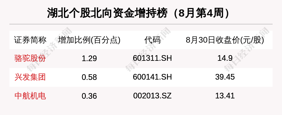 再看北向资金,8月第4周,骆驼股份北向资金持股比例增加1.29个百分点,兴发集团北向资金持股比例增加0.58个百分点,中航机电北向资金持股比例增加0.36个百分点。