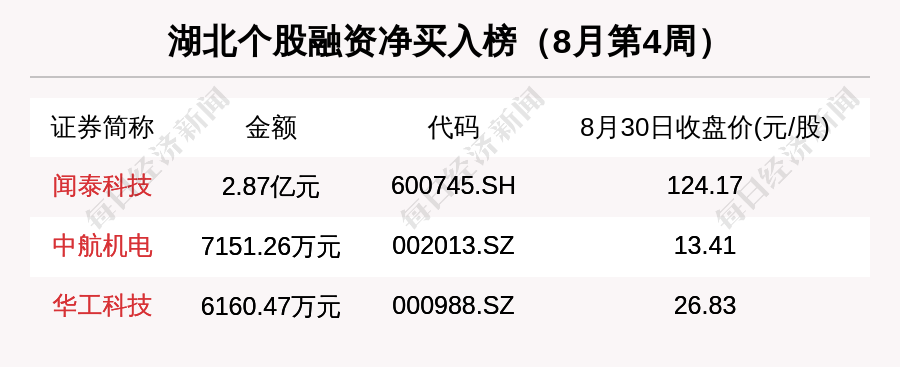 先看融资资金,8月第4周,湖北板块融资净买入总额为1353.91万元。融资净买入最多的湖北股是闻泰科技,金额是2.87亿元。其次是中航机电(7151.26万元)和华工科技(6160.47万元)。
