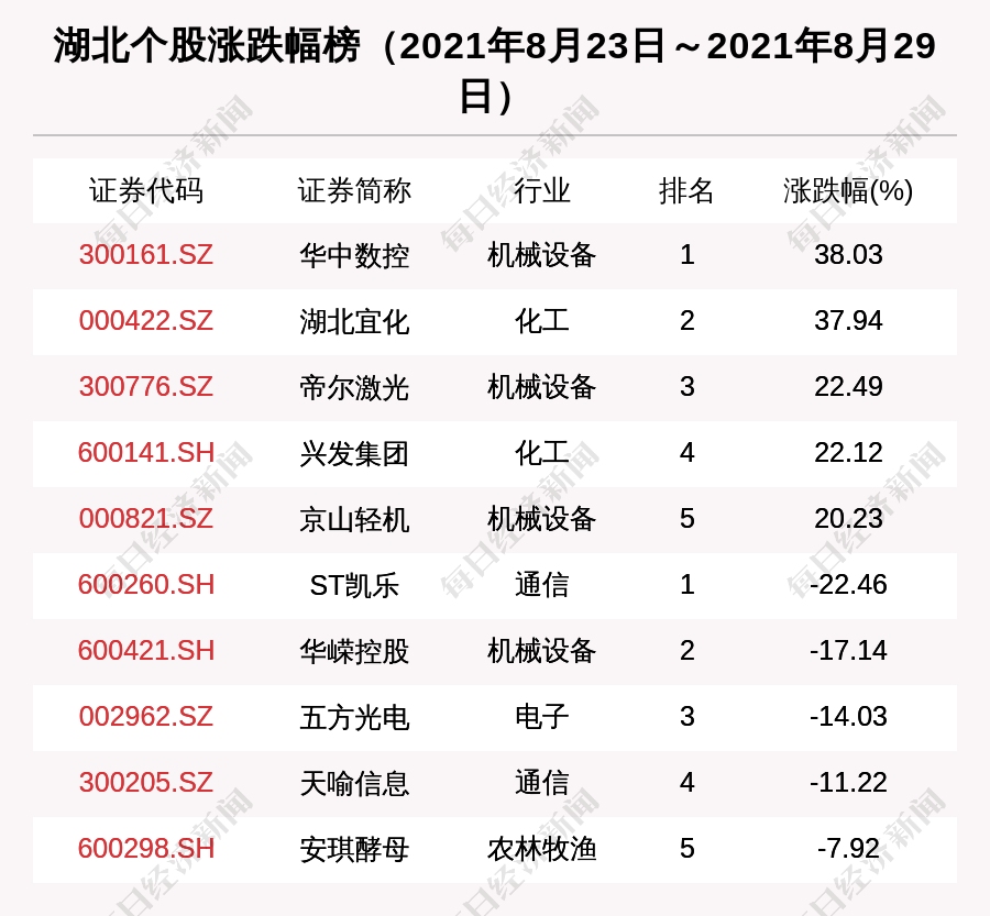 从涨跌幅来看,上周涨幅最大的湖北公司是华中数控,上涨幅度为38.03%。跌幅最大的是ST凯乐,下跌幅度为22.46%。