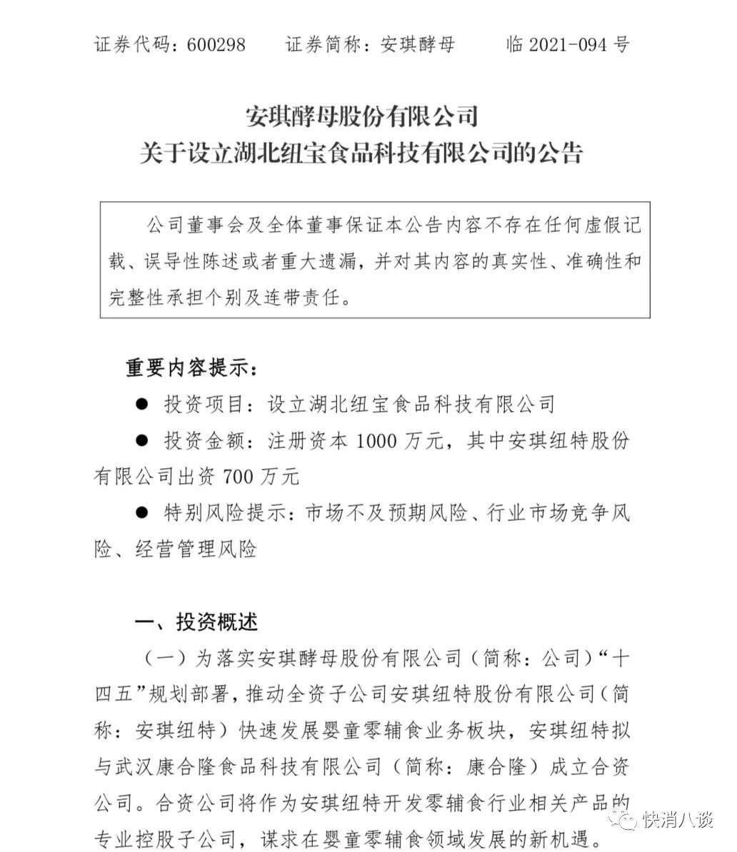 根据公告,为推动全资子公司安琪纽特快速发展婴童零辅食业务板块,安琪纽特拟与康合隆成立合资公司。合资公司将作为安琪纽特开发零辅食行业相关产品的专业控股子公司,谋求在婴童零辅食领域发展的新机遇。