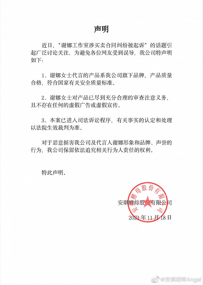 11月18日下午,针对“谢娜工作室涉买卖合同纠纷被起诉”一事,品牌方安琪酵母通过官方微博@安琪纽特Angel 发布回应声明。