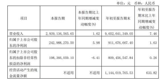 10月24日,安琪酵母(600298)发布2023年第三季度报告。根据财报,第三季度,安琪酵母实现营业收入29.39亿元,同比增长1.62%;归属于上市公司股东的净利润2.43亿元,同比增长5.98%。