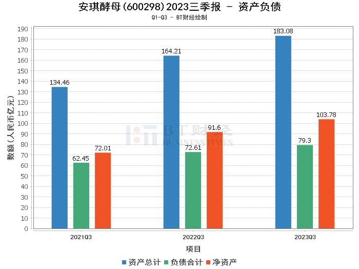 在资产负债方面,安琪酵母2023年三季度的总资产为183.08亿元,相比上年度末的169.3亿元增长8.14%。负债合计79.3亿元,相比上年度末的73.21亿元增长8.31%。净资产为103.78亿元,相比上年度末的96.09亿元增长8.01%。资产负债率为43.31%,与上年度末的43.24%相比略有增加。这些变化主要是由于融资租赁业务增加、工程项目转固、广告代言摊销费减少、长期借款重分类金额减少、银行借款增加、归还国开行长期应付款、收到的政府补助增加、限制性股票解禁等原因所致。