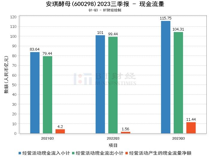 在现金流量方面,安琪酵母2023年三季度的经营活动产生的现金流量净额为11.44亿元,相比上年同期的1.56亿元大幅增长633.82%。经营活动现金流入小计为115.75亿元,相比上年同期的101亿元增长14.60%。经营活动现金流出小计为104.31亿元,相比上年同期的99.44亿元增长4.89%。这些变化主要是由于收到的政府补助增加、经营活动现金流入增加、处置固定资产收到的现金增加、去年同期处置喜旺公司等原因所致。