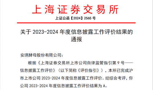 近日,上海证券交易所发布《沪市上市公司2023至2024年度信息披露工作评价结果》,安琪酵母获最高评级A级。据悉,此次参评的上市公司共2247家,评级为A的公司425家,占比为18.91%。