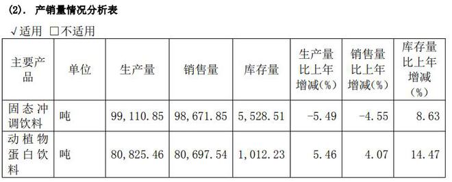 从产销量看,公司固态冲调饮料产销量均同比下降;动植物蛋白饮料产销量增加,收入下降,原因是乳饮客户结算价下调。