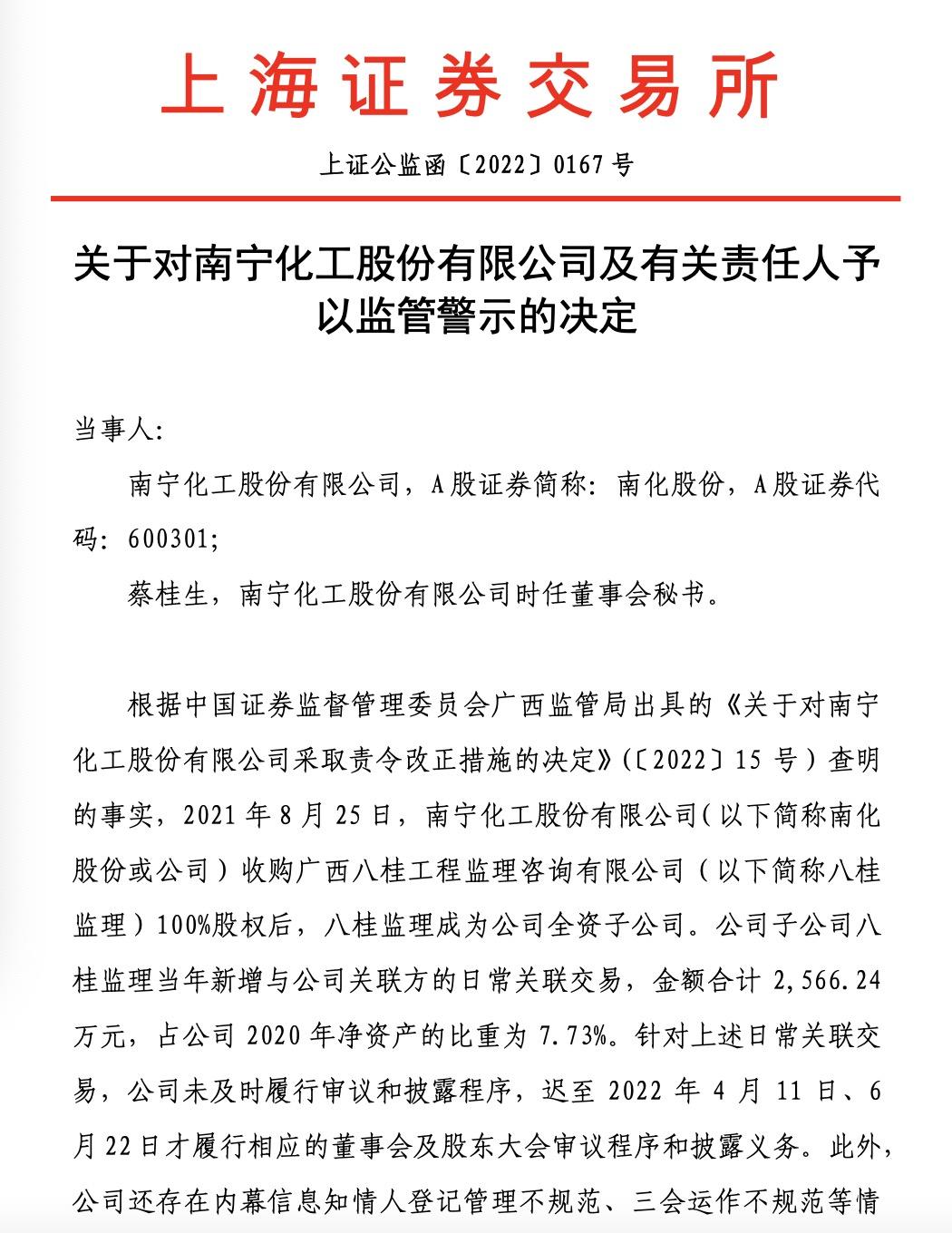 对南宁化工股份有限公司及时任董事会秘书蔡桂生予以监管警示。