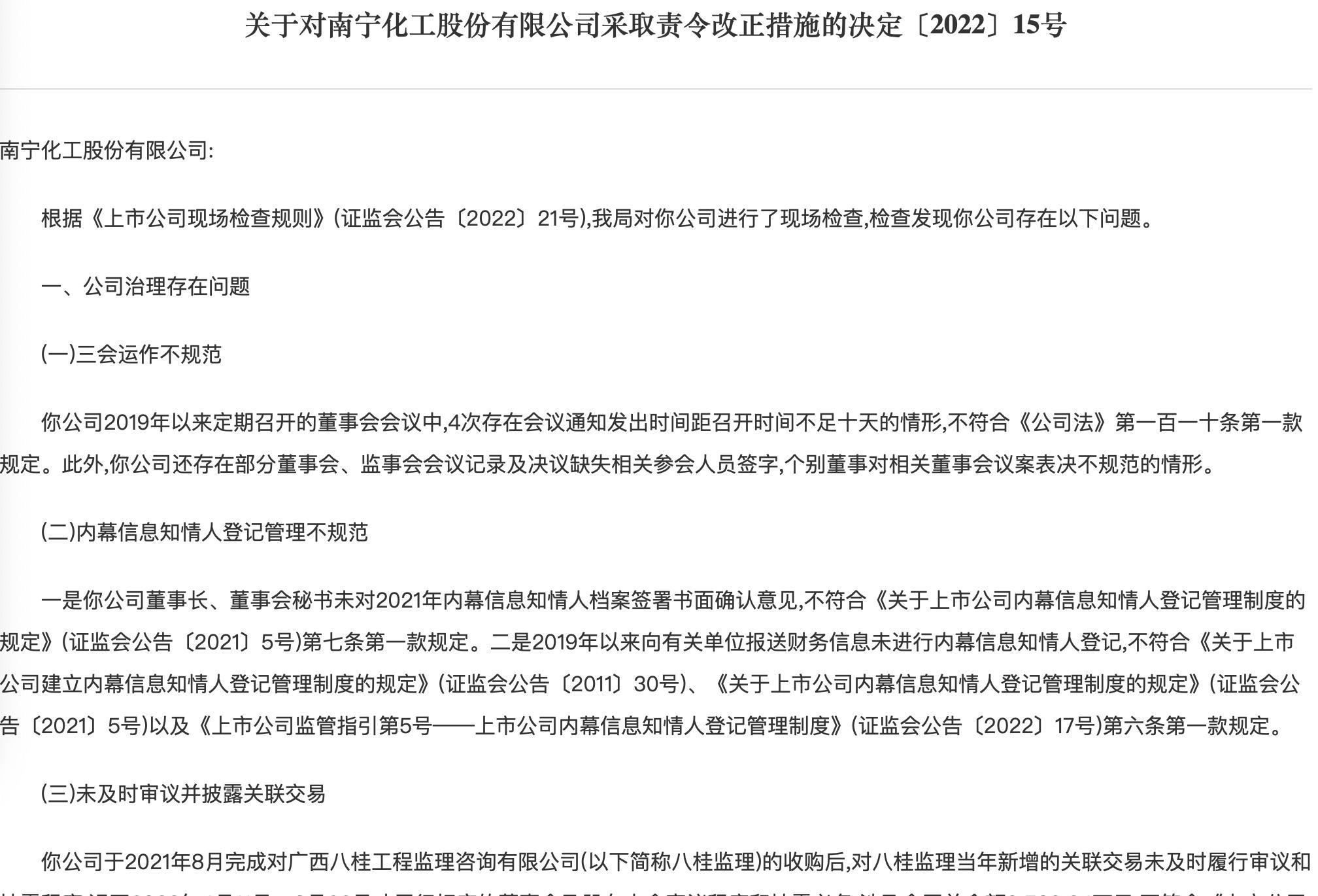 广西证监局网站2022年8月4日公布《关于对南宁化工股份有限公司采取责令改正措施的决定〔2022〕15号》显示,南化股份存在三会运作不规范、内幕信息知情人登记管理不规范、未及时审议并披露关联交易以及会计核算存在问题的情况。广西证监局决定对南化股份采取责令改正的行政监管措施,并记入证券期货市场诚信档案。