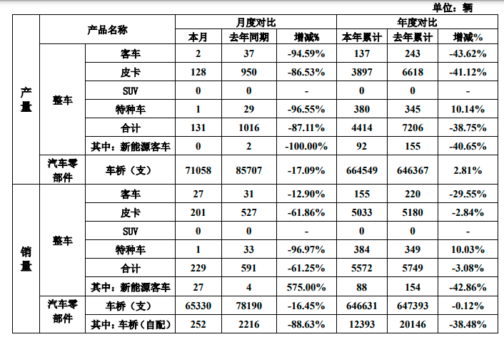 12月6日,曙光股份(SH600303)公告,1-11月新能源客车累计生产92辆,去年累计生产155辆,同比减少40.65%;1-11月新能源客车销售88辆,去年累计销售154辆,同比减少42.86%。