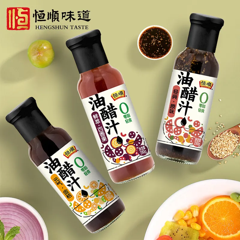 作为醋业老大,恒顺醋业发挥优势于2021年推出油醋汁产品,分为经典原味、元气金桔、鲜萃百香果、醇香橄榄、香麻藤椒等多种味型,满足消费者多元化的口味需求。例如经典原味油醋汁,由恒顺香醋添加浓缩苹果汁,搭配熟白芝麻的香气,酸酸甜甜,好吃不腻。而香麻藤椒油醋汁,则由恒顺六年陈香醋添加特级初榨橄榄油和藤椒油,香麻辛香,风味浓郁。