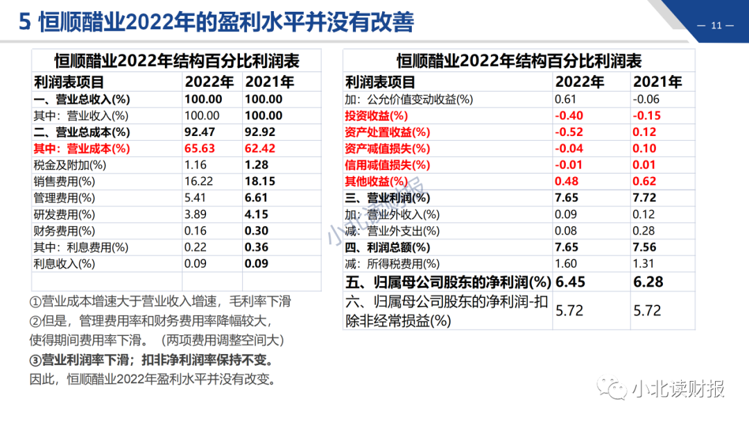 2022年,公司的营业利润率为7.65%,较2021年的7.72%略有下降,而归母扣非净利润率只有5.72%。同时,通过恒顺醋业2022年的结构百分比利润表,我们还能发现下面这些问题: