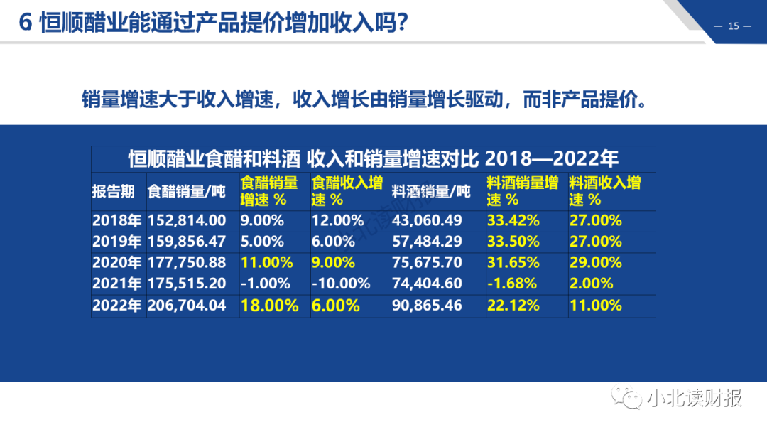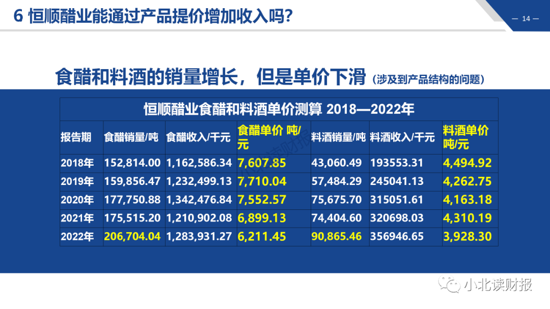 通过年报中每年的产销量数据,以及收入构成的数据,我们能测算出来公司每吨食醋和料酒的单价。