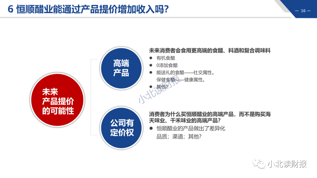 同质化的产品很难提价,因为有机醋、0添加食醋等,可能成为产品提价的噱头;但是恒顺能产的食醋和料酒,海天不能生产吗?山西老陈醋不能生产吗?千禾味业不能生产吗?除非是差异化特别明显的产品,否则消费者不会买单,也不必非得买恒顺的产品。