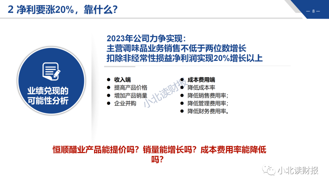 要想实现扣非净利润增长20%,得在收入端和成本费用端一起发力。但是削减期间费用只是小巧,最重要的是通过产品提价和增加销量来拉动收入的增长,进而提高净利润。
