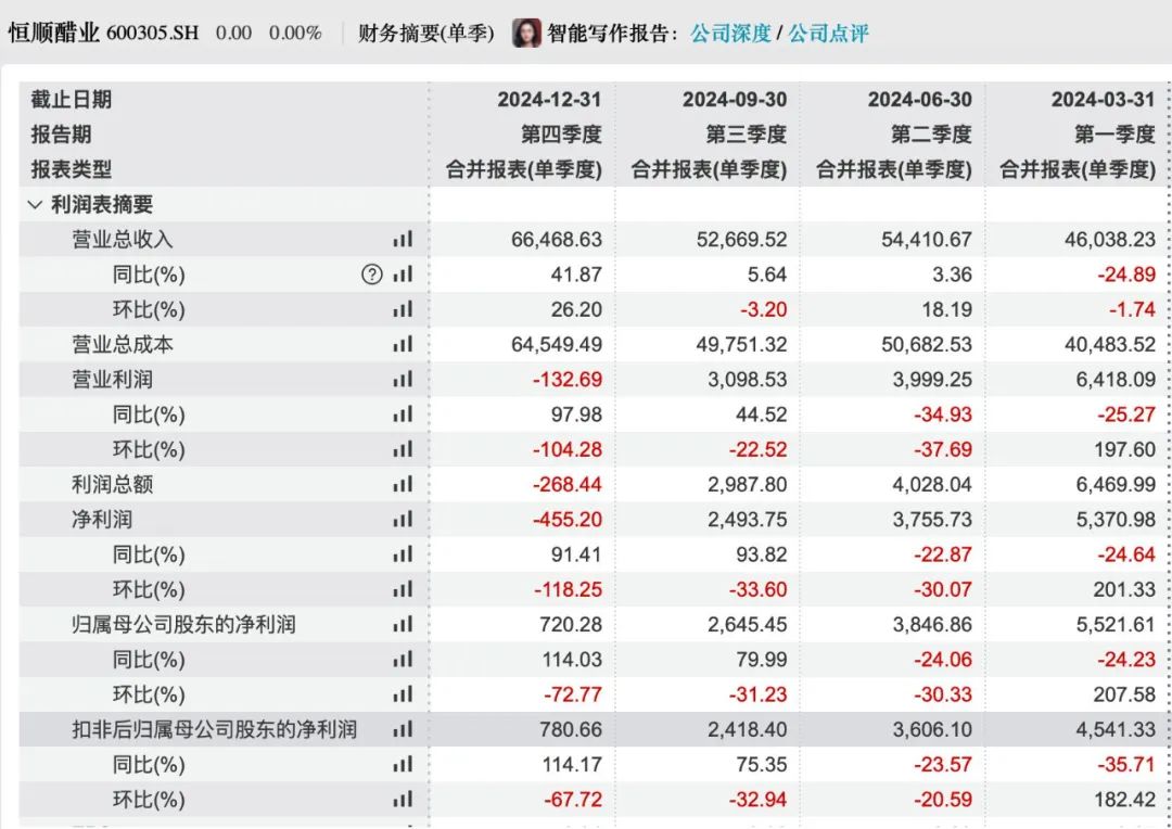 在经历多个财务季增收不增利之后,2024年恒顺醋业的归母净利润终于实现大幅增长。
