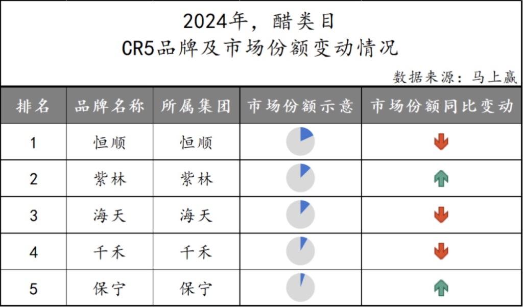 马上赢发布的《调味品行业2024线下零售数据解读》显示,2024年食醋类目CR5中,恒顺醋业虽然仍居第一,但市场份额呈下降趋势;食醋类目市场份额TOP5SKU(不含组合装)中,恒顺醋业虽然占据三席,但也均呈下降趋势。