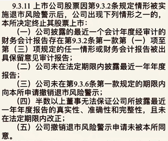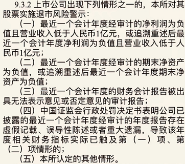 普及一下,非标审计意见主要分为6大类:即保留意见、否定意见、无法表示意见、强调事项段、与持续经营相关的重大不确定性、违反相关法律法规事项。同时,有必要再次普及一下注册制时代风险警示与退市条件,主要是《上市规则》中9.3.2条款与9.3.11条款: