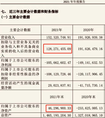 我们来看一下2021年报数据,其中“扣除与主营业务无关的业务收入和不具备商业实质的收入后的营业收入”只有1.28亿,勉强超过1亿,这里面还有432万的关联交易实现的收入。