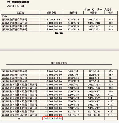 从2018年开始,到2021年,*ST商不停向茂业商厦、茂业集团借钱度日,后又向深圳领先半导体借款。借款金额累计超过3亿,借款明细如下: