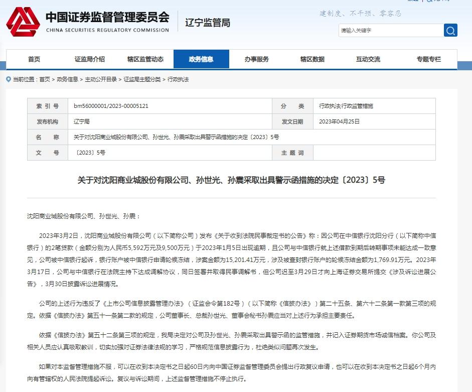辽宁证监局对*ST商城及孙世光、孙震采取出具警示函的监管措施,并记入证券期货市场诚信档案。