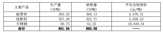 2023年,公司板带材生产量303.53万吨,销售量304.13万吨,平均含税售价4,570.31元/吨;线棒材生产量527.28万吨,销售量523.71万吨,平均含税售价3,938.23元/吨;不锈钢生产量60.75万吨,销售量62.25万吨,平均含税售价10,630.54元/吨。