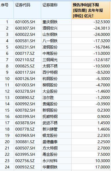 数据显示,截至发稿,A股有24家钢铁行业上市公司发布2024年业绩预告,从预告净利润下限来看,10家公司实现盈利,14家公司出现亏损。