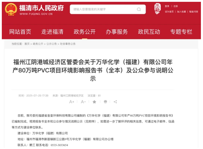 7月29日,福清市人民政府网站发布了福州江阴港城经济区管委会关于万华化学(福建)有限公司年产80万吨PVC项目环境影响报告书(全本)及公众参与说明公示。