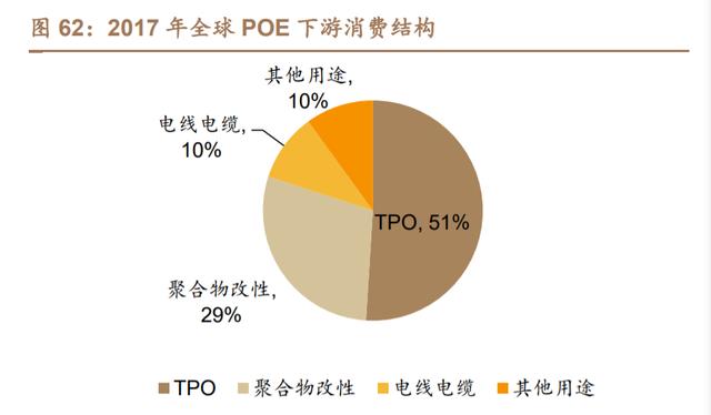 国内 POE 的消费结构有较大的提升空间。2017 年全球消费最多 POE 的是 TPO 终端领域,占比为 51%;用于聚合物改性的 POE 占比为 29%,用于生产电线电缆的 POE 占比为 10%,其他用途占比为 10%。而在国内,汽车是消费量最大的领域,占比为 68%;用于聚合物改性和生产电线电缆的占比分别为 19%和 9%。考虑到国外的汽车保险杠大部分已经采用 POE 进行共混改性,而国内只有约 20%的保险杠材料采用 POE,国内汽车制造和塑料制造领域的 POE 应用率仍有很大的提升空间。