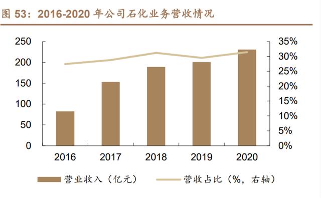 2.石化系列:公司大乙烯项目一期于 2020 年底顺利投产,随着一期逐步达产,石化板块将迎来快速发展,同时公司已经启动乙烯二期的建设,预计石化板块 2021-2023 年分别实现营收 486 亿元、516 亿元和 509 亿元。