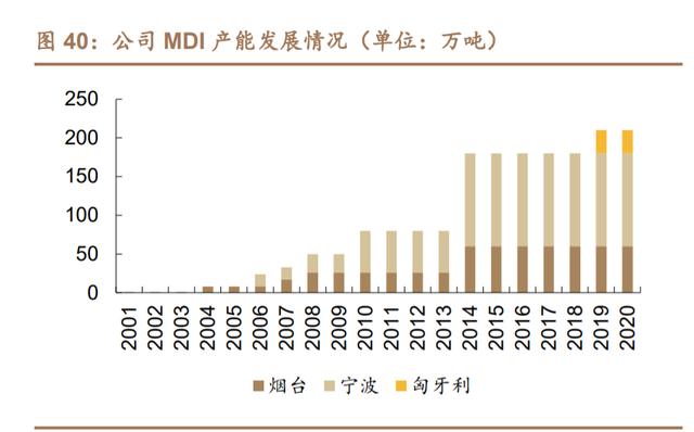 2011 年,第五代新型光化反应技术在烟台、宁波三套 MDI 装置上全部应用成功,MDI 总产能从 80 万吨提高至 124 万吨/年。2014 年起,万华宁波和烟台基地 MDI 的年产能已经分别达到 120 万吨和 60 万吨。 2019 年,万华化学实现整体上市,匈牙利 BC 公司成功注入上市公司,匈牙利基地 MDI 产能为 30 万吨/年。2021 年,烟台基地完成技改扩能,MDI 产能达到 11万吨。万华化学 MDI 国内产能占比近 60%,龙头地位突出。