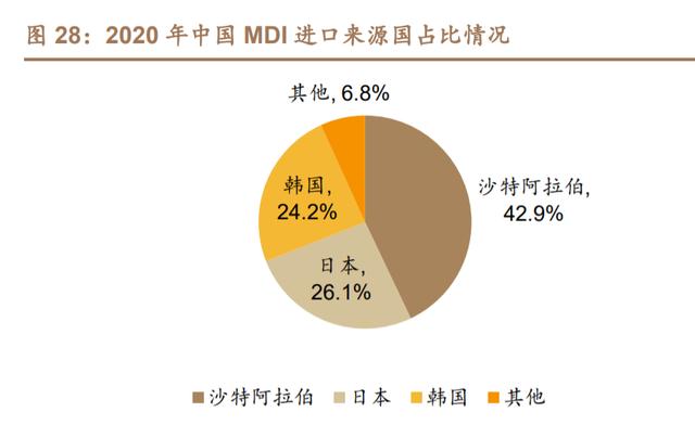 中国 MDI 主要进口国为沙特和日韩,主要出口至美国。2020 年,中国进口 MDI 总量中,沙特、日本和韩国各占 42.9%,26.1%和 24.2%,合计占比超过 90%。其中,日韩两国一方面价格较有优势,另一方面由于纯 MDI 在运输中需要保温,两国的地理优势使其占据了中国纯 MDI 进口市场的重要地位。中国 MDI 主要出口至美国,荷兰及其他亚洲地区,其中美国占比超 20%,导致中国 MDI 的出口量及价格容易受到中美贸易摩擦影响。