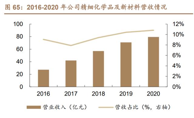 精细化学品及新材料业务发展迅猛,未来空间广阔。2020 年,公司精细化学品及新材料业务实现营业收入 79.48 亿元,2016-2020 年 CAGR 达 30.60%,在公司三大业务中增速最快,潜力巨大。