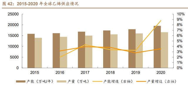 全球乙烯仍处于快速发展阶段。北美页岩气革命成功带动新一轮投资热潮,目前正进入产能释放高峰期。同时,中国民营大炼化项目和外资大乙烯项目投资积极性高涨,产能持续增加。2020 年,全球乙烯产能约 1.96 亿吨,产量约 1.66 亿吨,2015-2020 年产能和产量的年均复合增速分别为 4.33%和 3.46%。据石化联合会预测,2021 年全球乙烯产能将达到 2.06 亿吨/年,2025 年和 2030 年全球乙烯产能将分别达到 2.32 和 2.52 亿吨。
